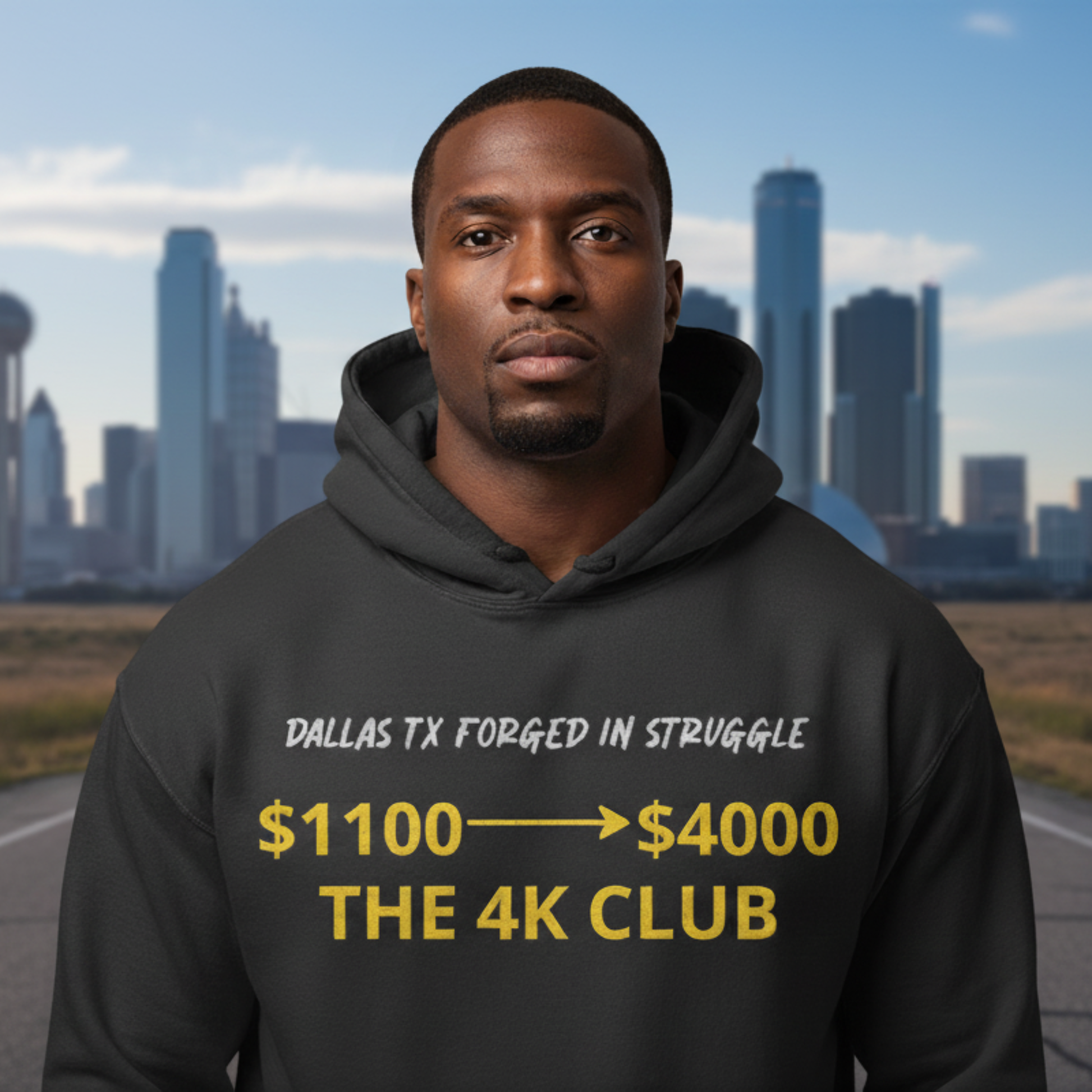 Crafted for ultimate durability and comfort, the 4K Club Hoodie is made with premium, heavyweight cross-grain cotton blend—the kind built to last as long as your resolve. The iconic $1100 \to 4000$ graphic and the phrase "DALLAS TX // FORGED IN STRUGGLE" are meticulously embroidered for a textured, high-end finish that stands apart from typical printed wear. We believe resilience deserves quality, and this piece delivers on that promise. It features an oversized, relaxed fit, a true mark of premium streetwear, designed to provide comfort on the toughest days and style on the strongest ones.